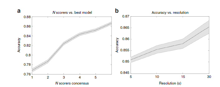 - 수면 단계를 평가하는 데 있어서,N scorers간의 consensus vs best model 비교