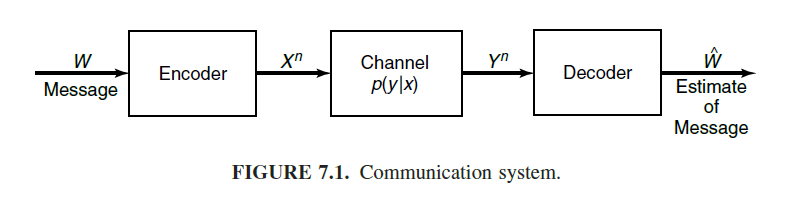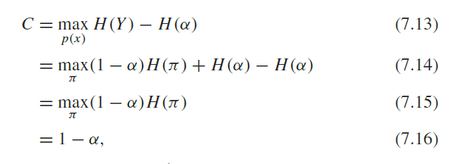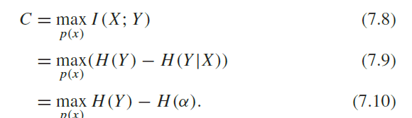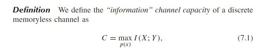 7.1의 정의는 다음과 같다. channel의 용량 capacity는 아래와 같의 정의된다. 둘 사이의 Mutual information을 maximize하는 p(x)가 C이다.