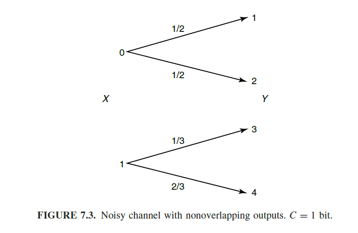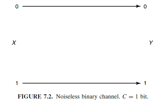 7.2와 같이 Noiseless한 binary channel은 다음과 같다. 이 때 C=1이다. 조금 더 구체적으로 설명하자면, 위의 C가 I(X;Y)를 maximize할 때 이므로, p(x) = (1/2, 1/2)이다. 이 p(x)의 Entropy = 1이며, 따라서 Mutual information을 계산하였을 때, p(x,y) log p(x,y)/p(x)p(y) = 1/2 x log( 1/2 / ((1/2) x (1/2)) + 1/2 x log( 1/2 / ((1/2) x (1/2)) = 1/2 x log 2 + 1/2 x log 2 = 1