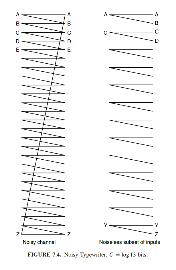 이번엔 출력이 겹치는 Noisy한 입력이 있다고 할 때, Source code를 완전히 복구하는 것은 어렵다. 따라서 이럴 경우에는 A,C .. 와 같이 홀수번째 알파벳만 보내 Noise를 없앤다. 이렇게 하면 완전하게 통신을 하지는 못하지만, 절반만큼 보낼 수 있다. 따라서 log 13bit가 capacity가 된다. 최소한 13비트는 오류 없이 보낼 수 있다.
