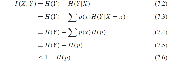 7.4 - 7.5 H(Y|X) 수식 전개해서 H(p)로 p에 대한 Entropy로 변경.