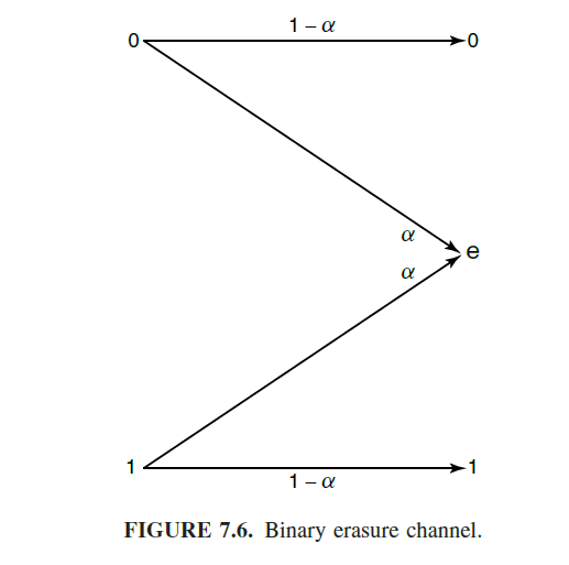 - 이번에는 특정 비트가 지워지는 경우이다. 즉, 0,1의 두가지 비트를 입력했을 때, 0,1,e의 3가지 경우가 나오는 경우다. 앞선 경우와 마찬가지로 오류로 갈 확률 (Noise)가 될 확률이 alpha이고, 1-alpha가 정상적으로 전송될 확률이다.